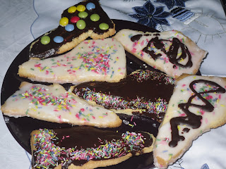 Când biscuiţii sunt gata, îi scoateţi din cuptor şi îi acoperiţi (calzi) cu glazura colorată. Pe fiecare “pantofior” se aplică apoi perle comestibile, bombonele şi alte decoraţiuni.