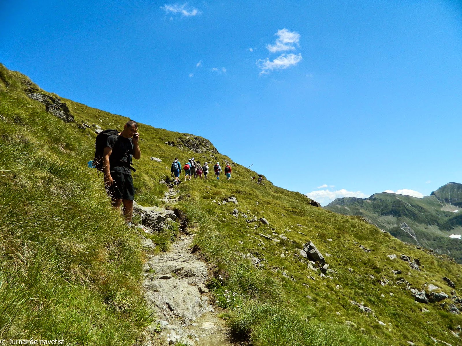 A urmat un traseu sec care ne-a întins la maxim rezistenţa la stres, pe o potecă ce părea desenată. Ne-am bucurat în schimb de un peisaj spectaculos, de linia crestelor şi frumuseţea văilor din Făgăraş. Dacă cu un an în urmă adulţii din grup erau cei care se ocupau de trasee, acum chiar şi cei mici au început să aibă păreri despre drumul pe care urma să-l parcurgem. Odată cu înaintarea pauzele s-au înteţit iar oboseala a început să-şi spună cuvântul.În plus, ne apropiam de unul dintre punctele „fierbinţi” ale traseului – Fereastra Zmeilor (2175m)- despre care citisem tot felul de grozăvii. Această porţiune pe noi însă nu ne-a impresionat.