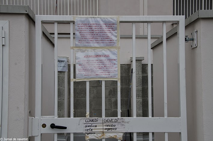 Luni ambalajele de plastic şi hârtia, joi cutia cu nediferenţiate, luni şi joi organicul….Sticlele le pui în coşul bicicletei sau în portbagaj şi dai o tură de cartier până găseşti un container special pentru sticle. Pe afiş e scris cu caractere BOLDATE: gunoiul trebuie adus în compartimentul special de lângă bloc DOAR în zilele de colectare, până în ora 8 dimineaţa!