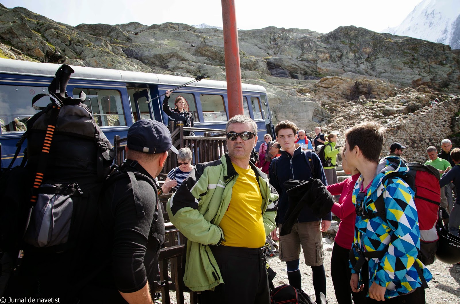 Mai erau şi „papucari” care făceau o plimbare cu trenuleţul, însă marea majoritate era pregătită pentru munte. Nu eram foarte stresaţi deoarece în prima zi aveam de urcat doar vreo 4 ore, ceea ce nu ni se părea deloc complicat. Aşa că, în trenuleţ am făcut glume, am mai tras cu urechea pe la „meseriaşii” care, foarte aroganţi, dădeau explicaţii destul de sumare. Aveam să ne întâlnim cu ei pe tot traseul, erau GHIZII DE MONT BLANC, adevăraţi “lupi” în căutare de clienţi. Ne-au vorbit mulţi înainte de a pleca de importanţa unui ghid pe acest traseu, însă acum la întoarcere pot să vă spun că din ce am observat – şi am fost foarte atent – sunt doar nişte domni puşi pe făcut bani şi pe speriat clienţii. Am văzut pe tot parcursul drumului o forfotă de ghizi care ar face bine să dea măcar o dungă de vopsea pe traseu! Un parcurs atât de complicat şi plin de turişti care să nu fie marcat măcar decent mi s-a părut lucrul cel mai odios din partea celor care se hrănesc din banii turiştilor ajunşi acolo.