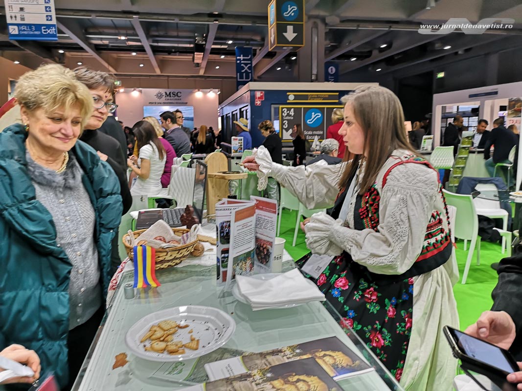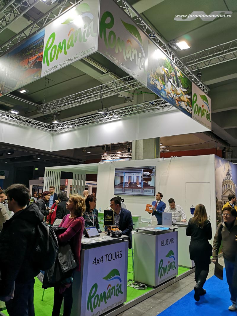 Ca amplasare, erau chiar lângă standul României. Hai să vă povestim și depre ai noștri: un stand frumos, măreț, luminos, într-o zonă bună, vizitată. Pe ecranele de sus erau prezentate imagini reprezentative cu cele mai cunoscute obiective turistice din țară, în timp ce în partea de jos ieșea în evidență Ateneul Român. Un stand imens, în care s-ar fi putut face multă promovare. Dar, din păcate, ceea ce tot spunem de vreo zece ani de când vizităm târgul de la Milano, s-a repetat și anul acesta: românului îi lipsește total entuziasmul și spiritul de țară. La desk-urile amplasate pe marginea standului erau prezente multe agenții care își prezentau ofertele de excursii, fiecare pe bucățica lui. Lipsa însă o regie de ansamblu, o imagine omogenă de țară iar oamenilor trimiși acolo le lipsea entuziasmul. Am apreciat prezența unei doamne îmbrăcate în costum popular, care încondeia ouă și atrăgea publicul interesat să vadă o demonstație de artă tradițională. Am mai remarcat pozitiv prezența județului Bihor, care avea materiale de promovare foarte atractive. Lipseau, din păcate, broșurile de la Ministerul Turismului, cu prezentarea generală a țării. Nu e suficient să fii prezent doar fizic la un astfel de eveniment, trebuie să te și implici, iar promovarea se face în mod diferențiat: în Italia promovezi mănăstirile din Bucovina (exista un stand dedicat cu pliante), Delta Dunării (am observat o singură imagine cu niște pelicani), Transilvania, dar și turismul gastronomic. Nu există statistici cu produsele noastre recunoscute și protejate la nivel european, nu știm să le punem în valoare. Suntem urmașii Imperiului roman, ca și italienii? Să îi atragem cu vestigiile romane de pe teritoriul României!